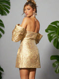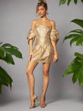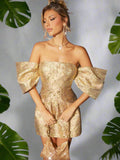 Sweetheart Jacquard Dress: Haute Off-Shoulder Puff Sleeve Elegance