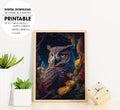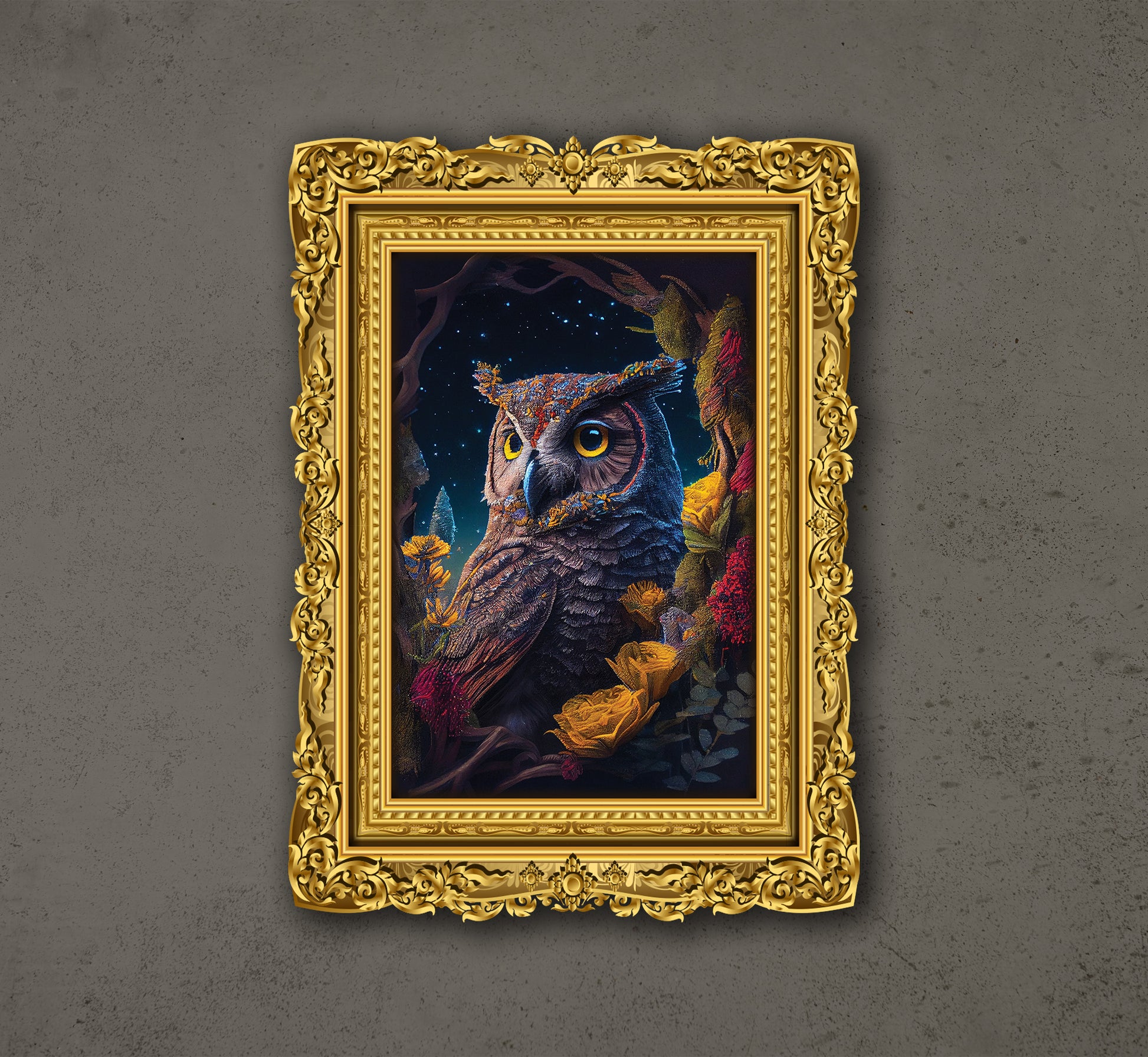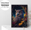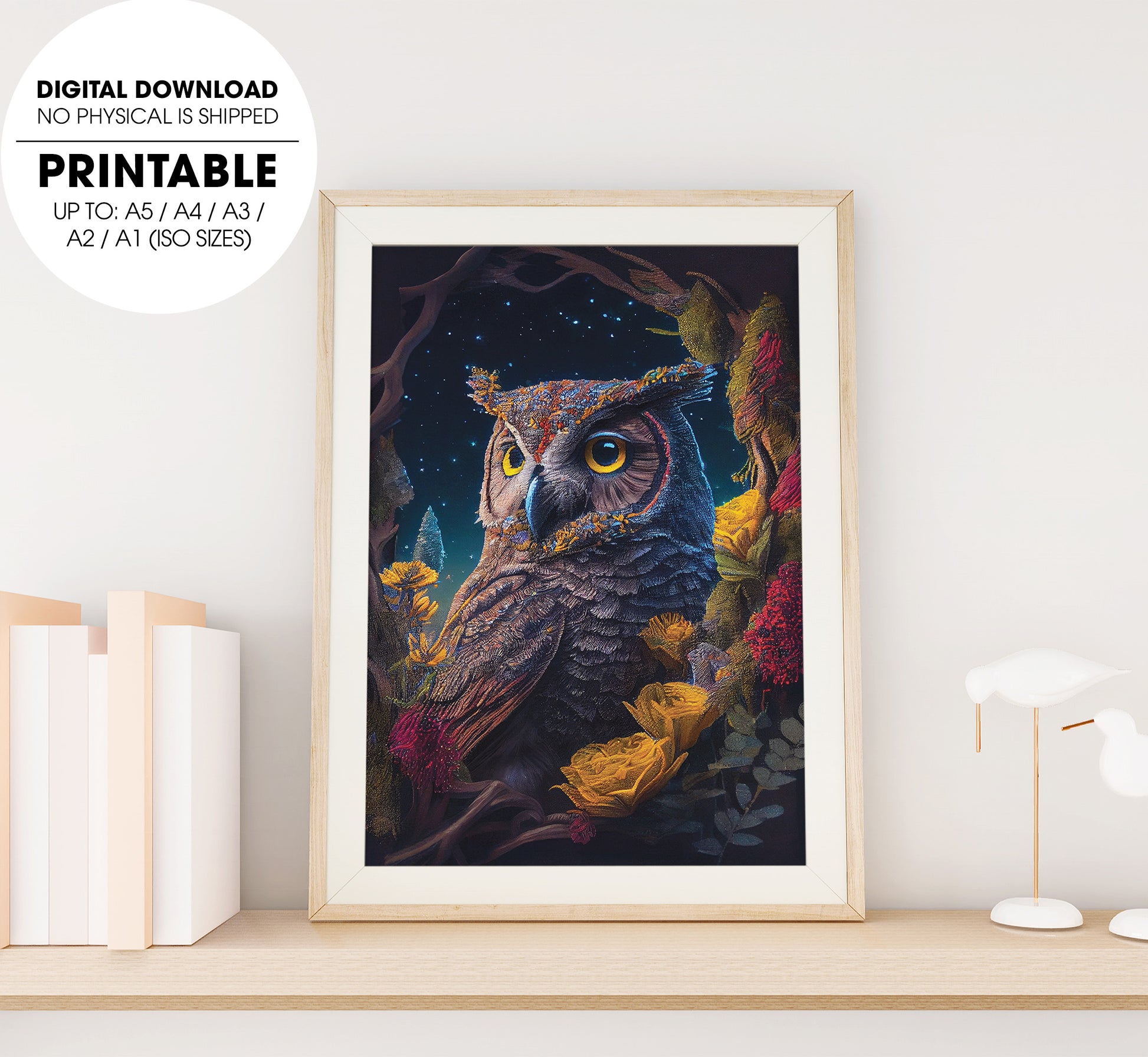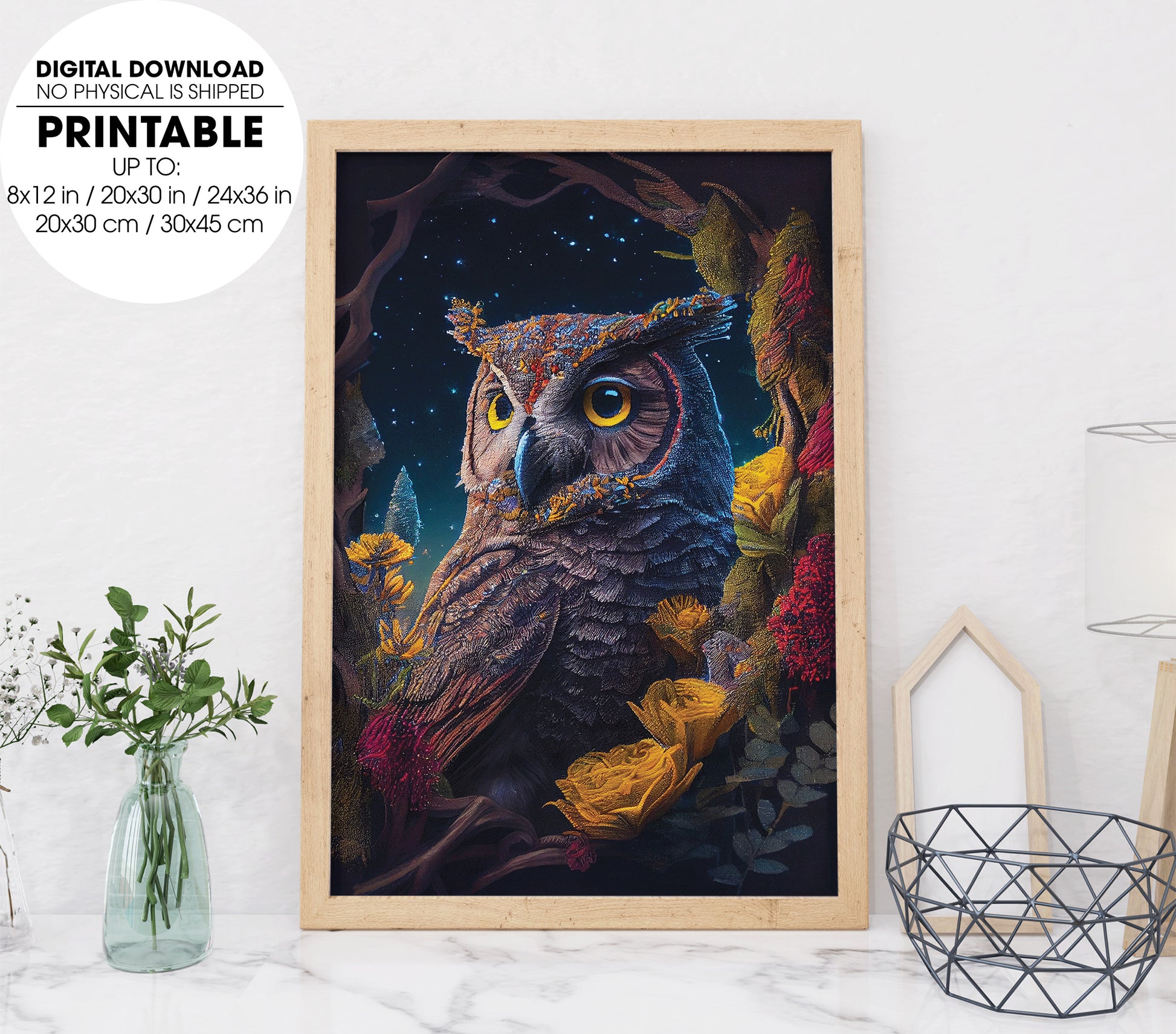 The Owl With Yellow Eyes In Magical Forest, Colorful Owl In The Forest, Poster Design, Printable Art