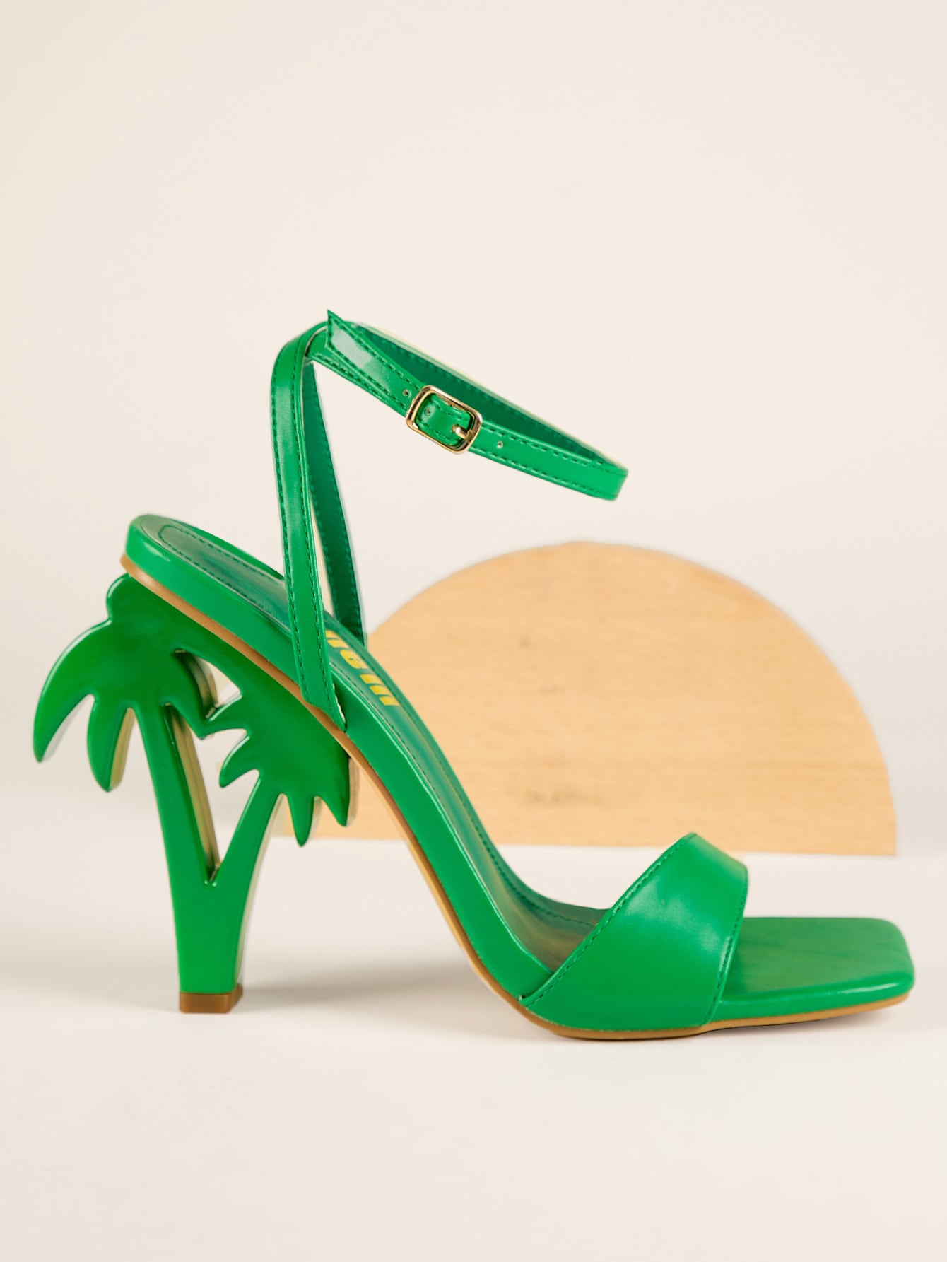 Introducing our Tropical Chic Faux Leather Palm Tree Heeled Sandals. Elevate your style with these glamorous heels featuring a playful palm tree design. Made with high-quality faux leather, they are both chic and comfortable. Perfect for adding a tropical touch to any outfit.