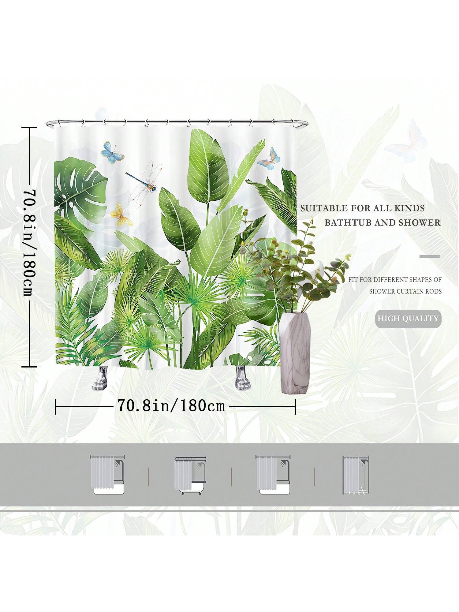 Escape to a tropical oasis in your own bathroom with our playful shower curtain! Featuring a charming turtle and leaf print, accented with dragonflies and butterflies, this curtain will add a touch of whimsy to your daily routine. Bring some fun to your bathroom decor today!
