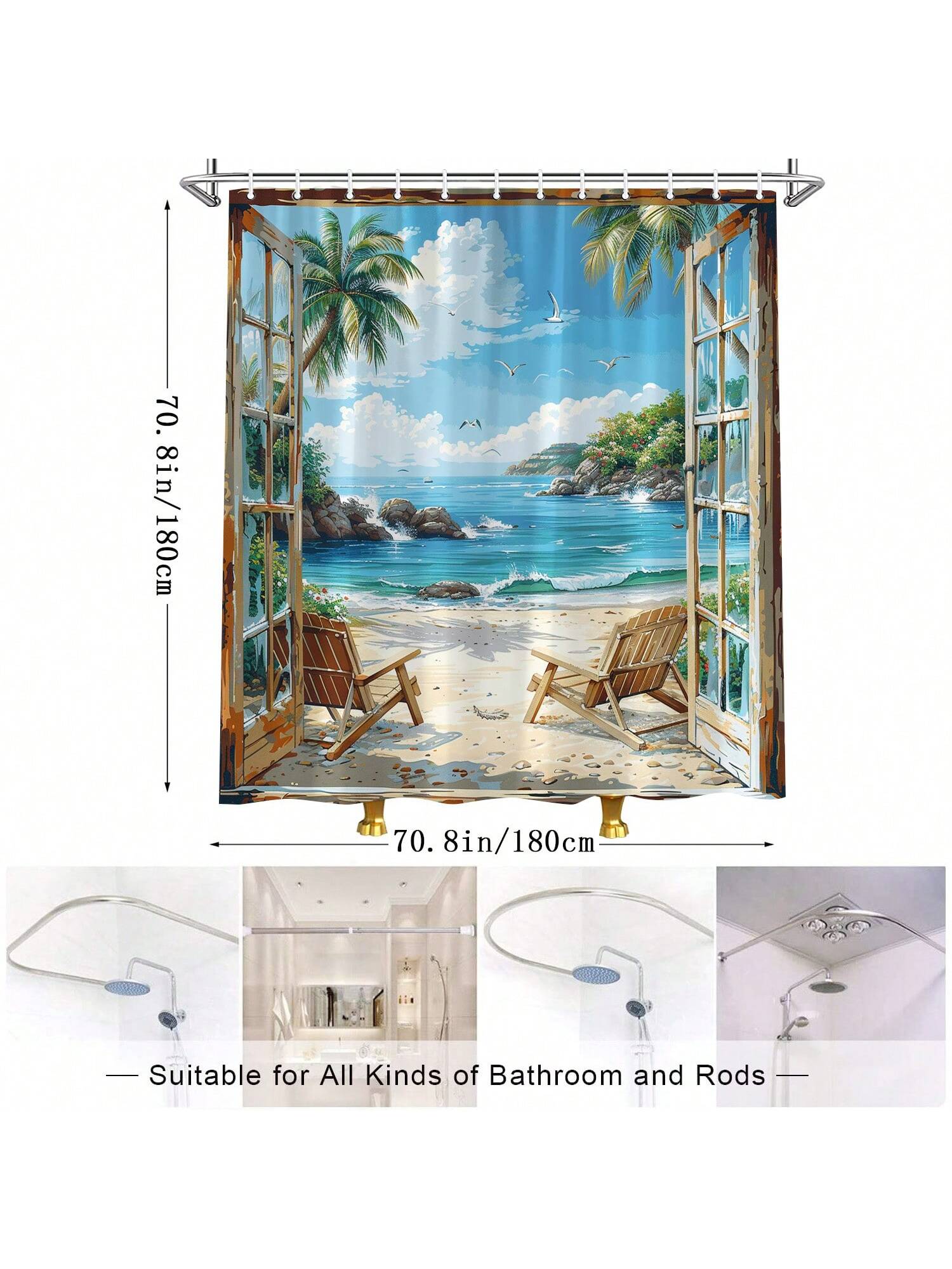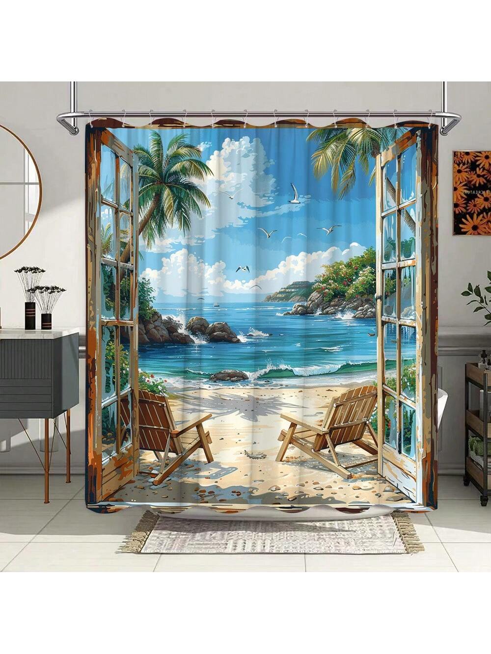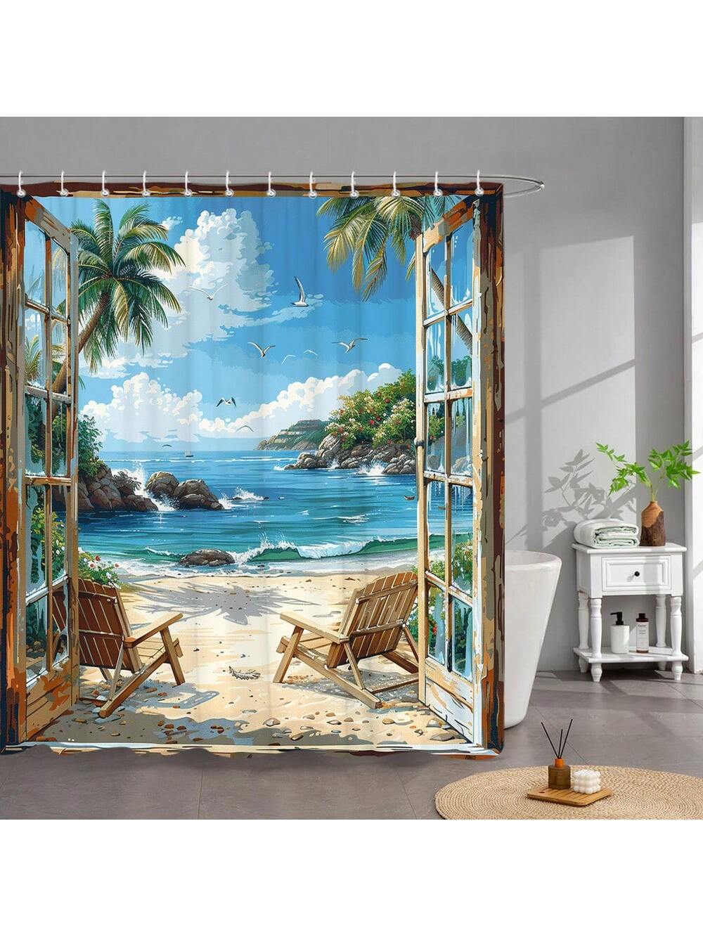 Transform your bathroom into a tropical paradise with our shower curtain. Featuring a serene ocean scenery of palm trees, seagulls, and coral reef, it's the perfect decoration to create a relaxing atmosphere. Made with high-quality materials and easy to install, it's the ultimate addition to any beach lover's bathroom.