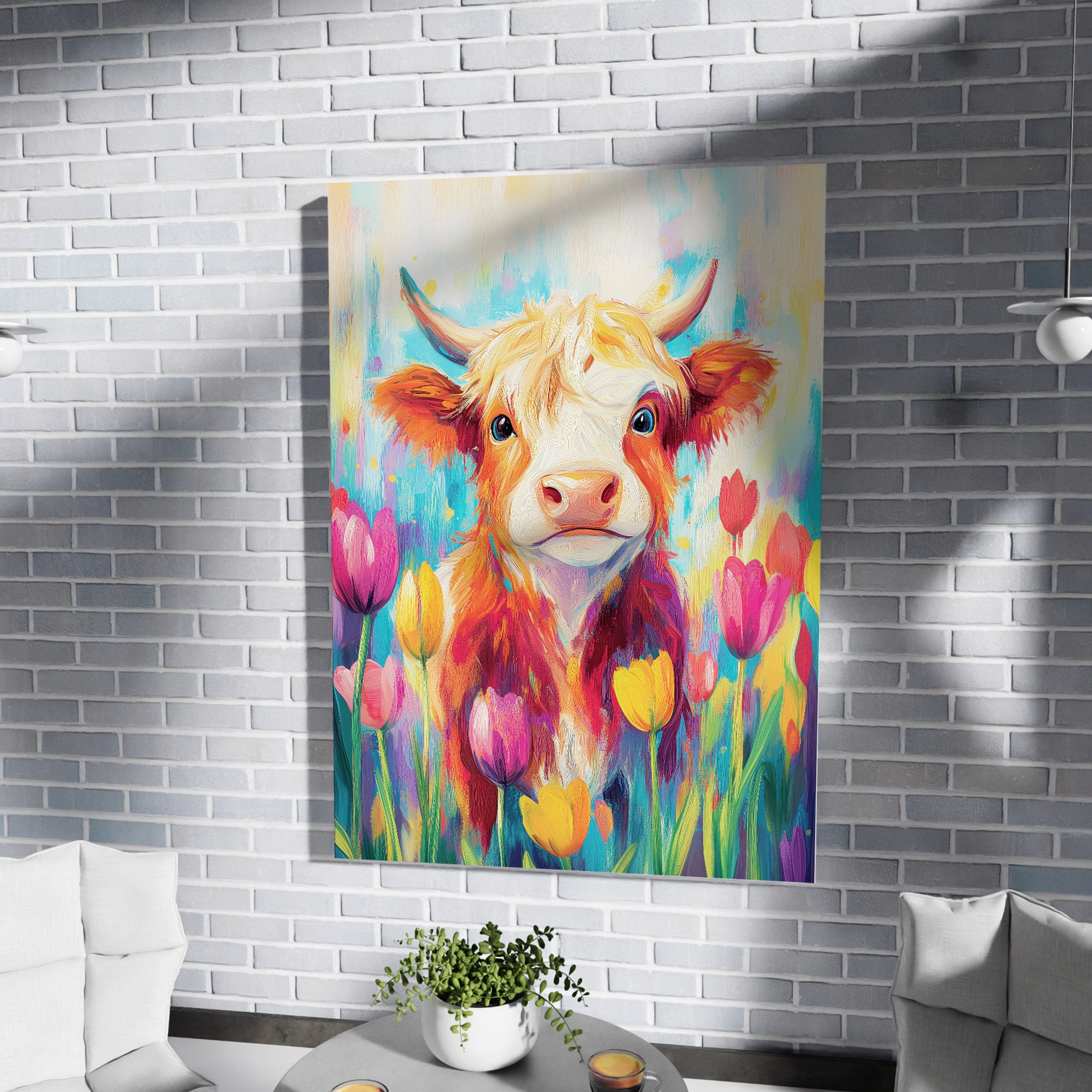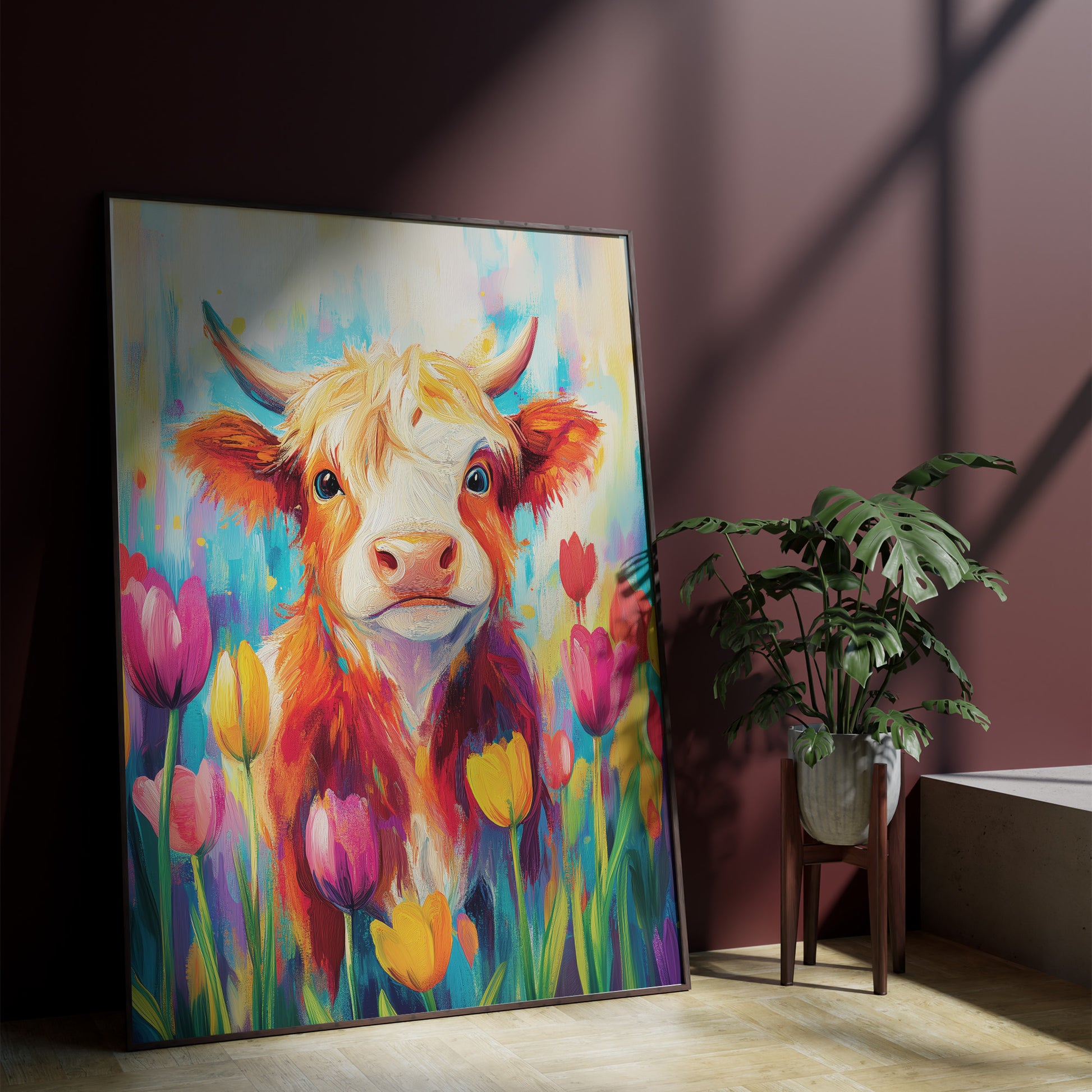 Vibrant Impasto Oil Painting Of A Colorful Highland Cow In A Tulip Field