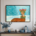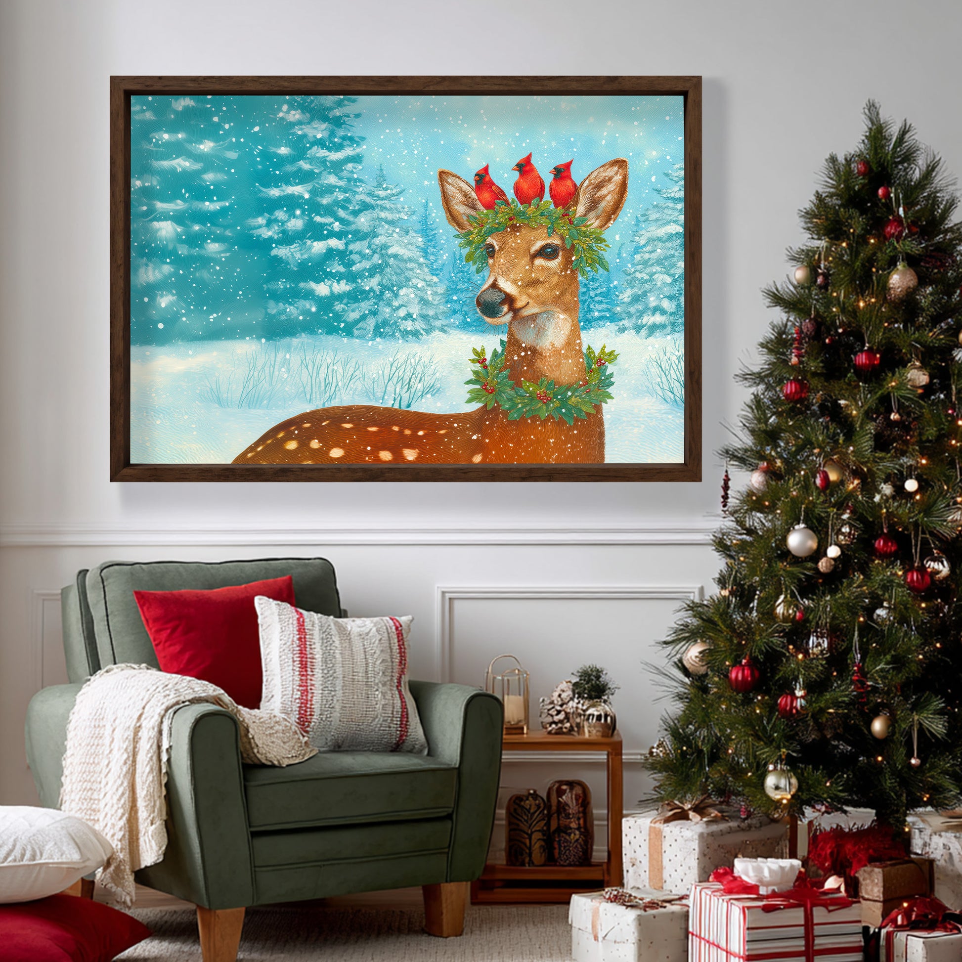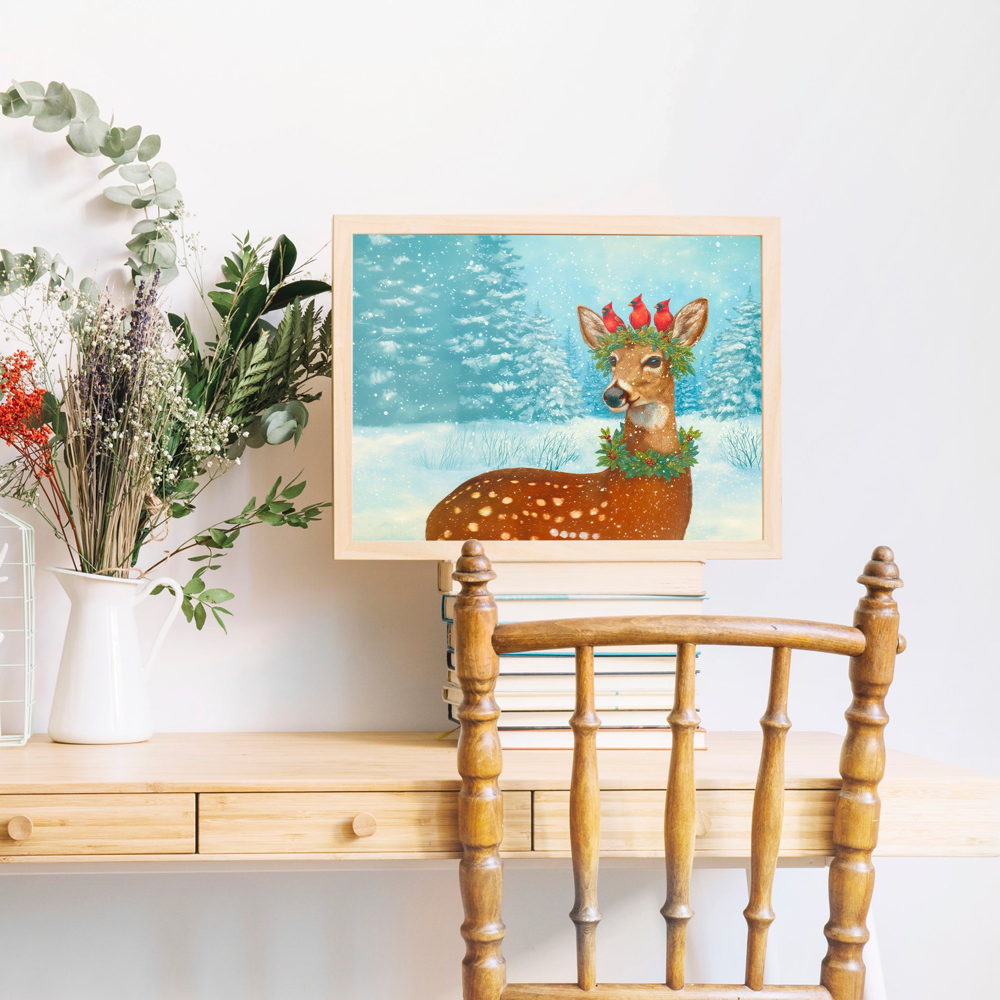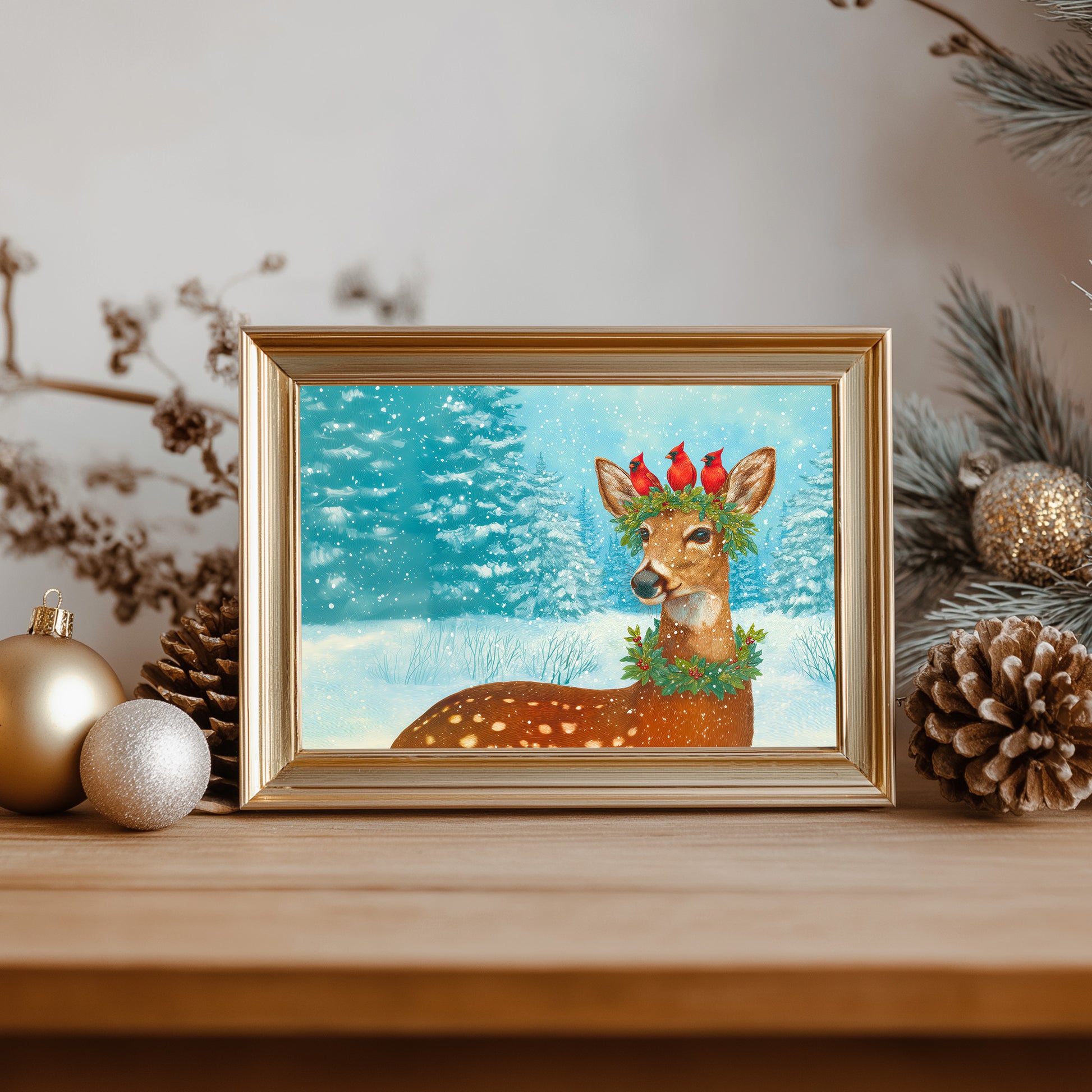 This charming Christmas illustration features a gentle winter fawn adorned with festive greenery and three bright red cardinals perched above its head. Set against a serene snowy forest backdrop, the artwork blends soft textures, warm tones, and a magical seasonal atmosphere. Perfect for holiday decorating, nursery walls, cozy living rooms, entryways, or woodland-themed spaces, this printable artwork brings a peaceful and enchanting touch to any home. High-resolution digital file is ready to print at your preferred size, ideal for gallery walls or holiday gifts.