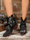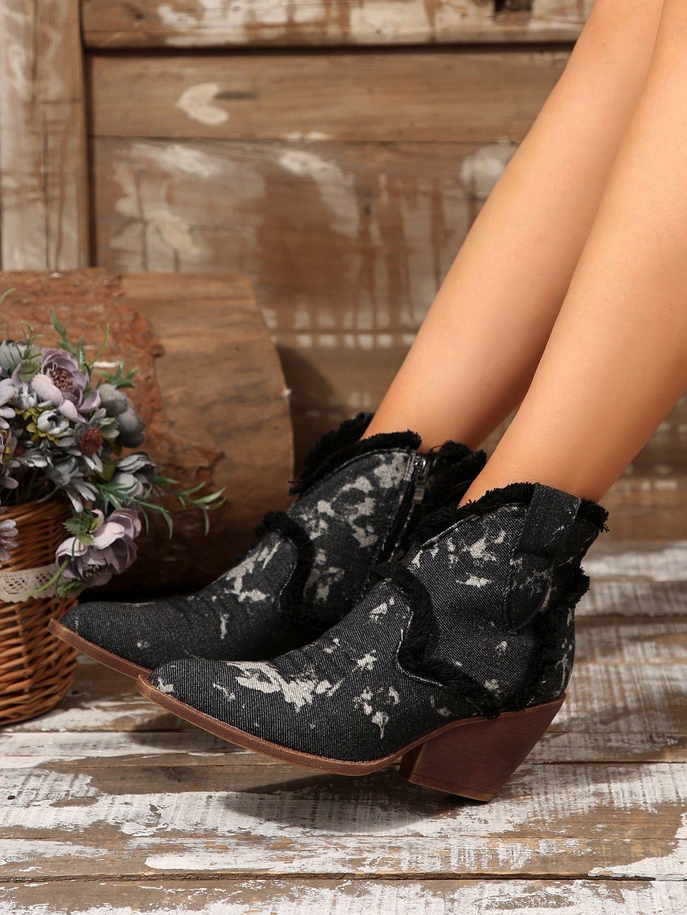 Vintage Distressed Western Cowgirl Boots: Chunky Heel V-Neck Short Boots