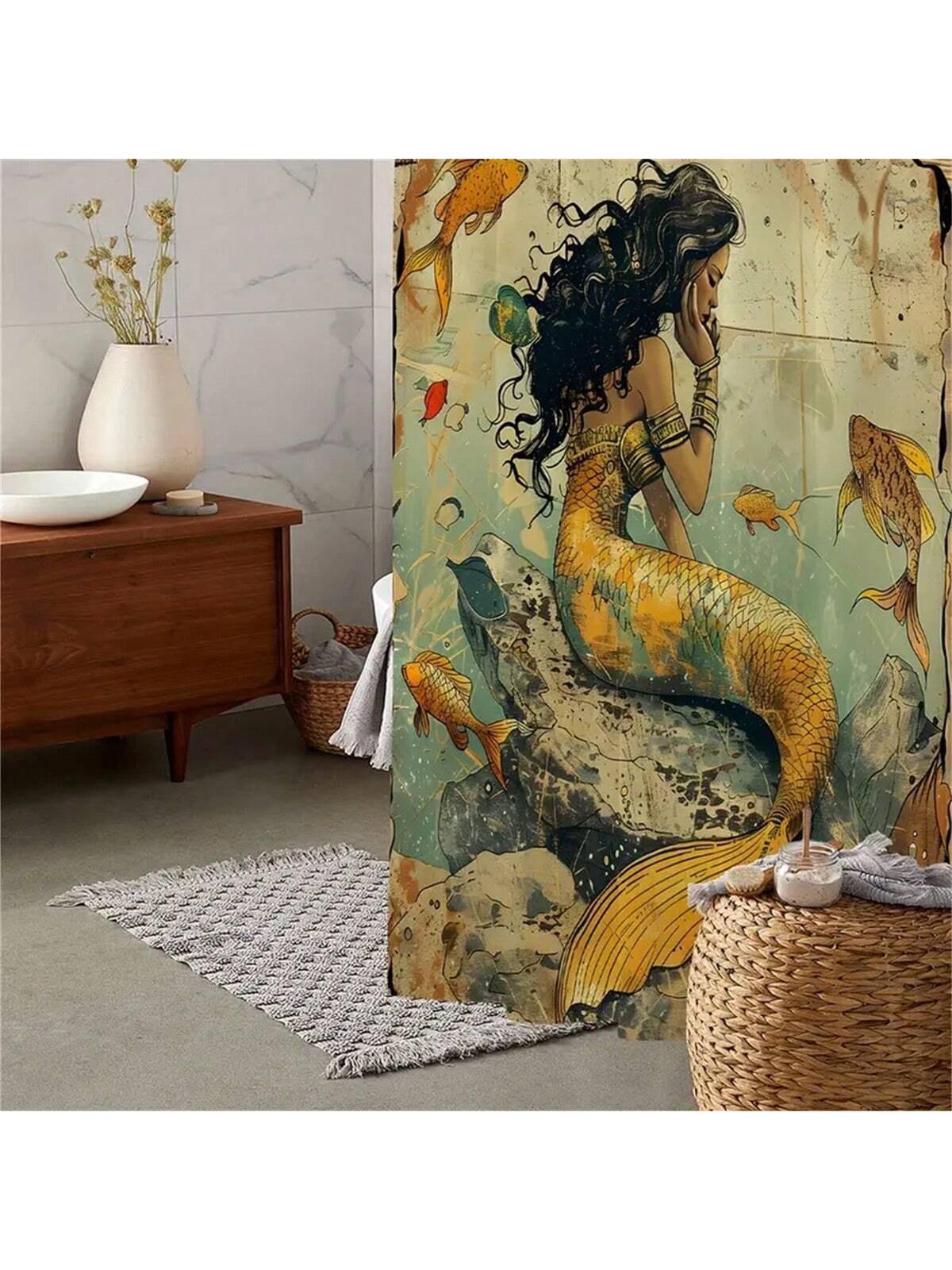 Vintage Ocean Mermaid Shower Curtain: Waterproof Polyester Bathroom Partition with Hooks