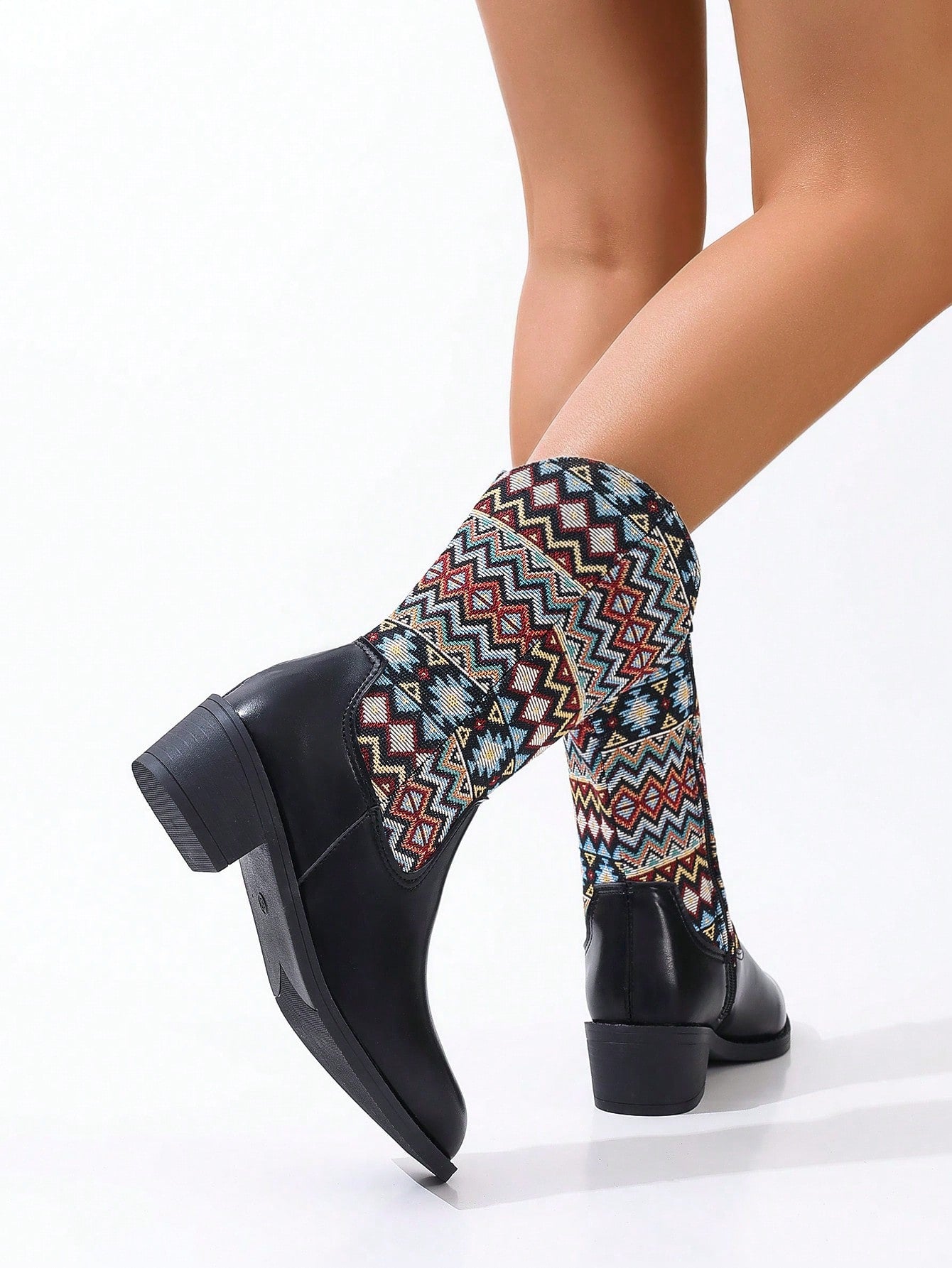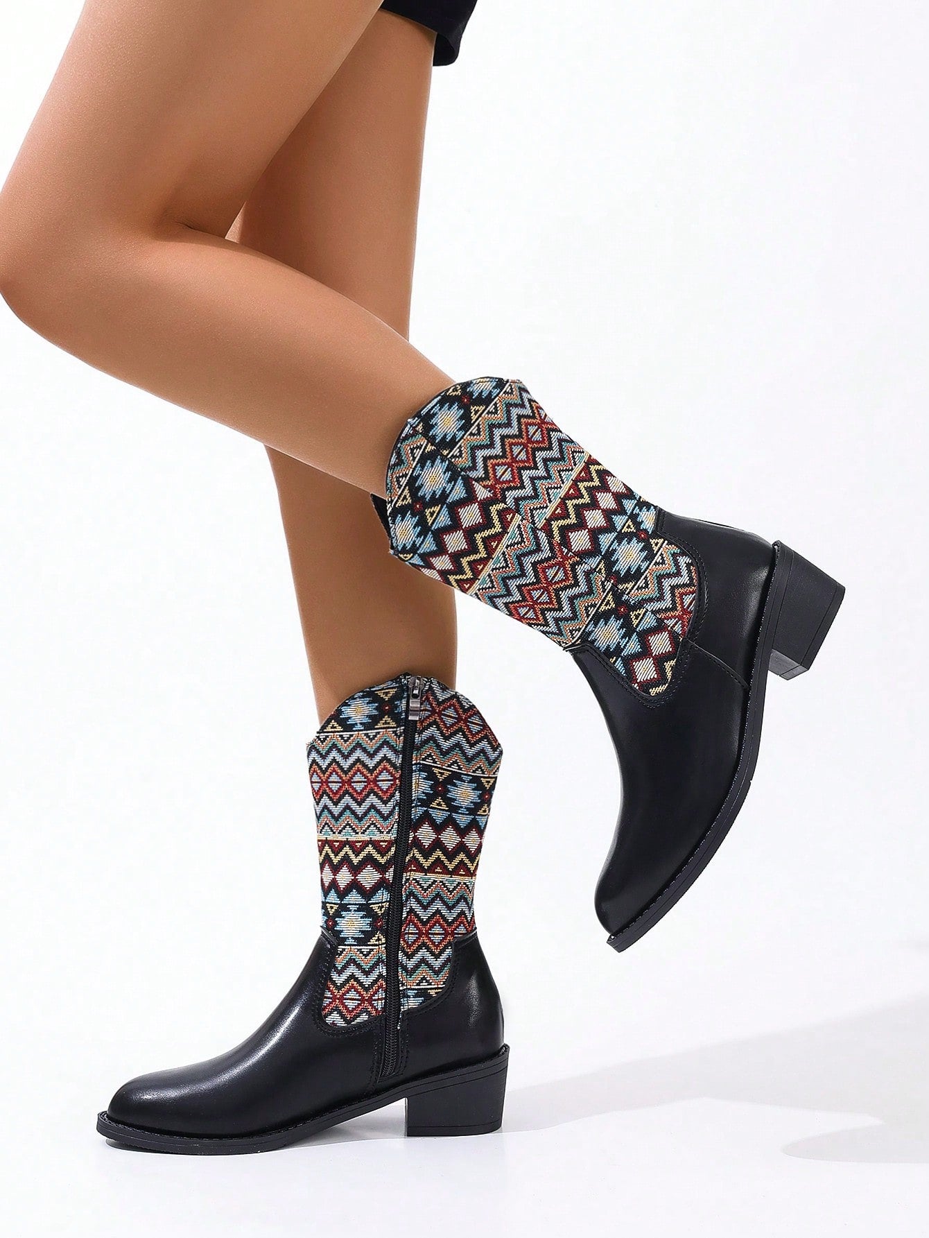 Vintage Vibe: Embroidered Chunky Heel Mid-Calf Riding Boots