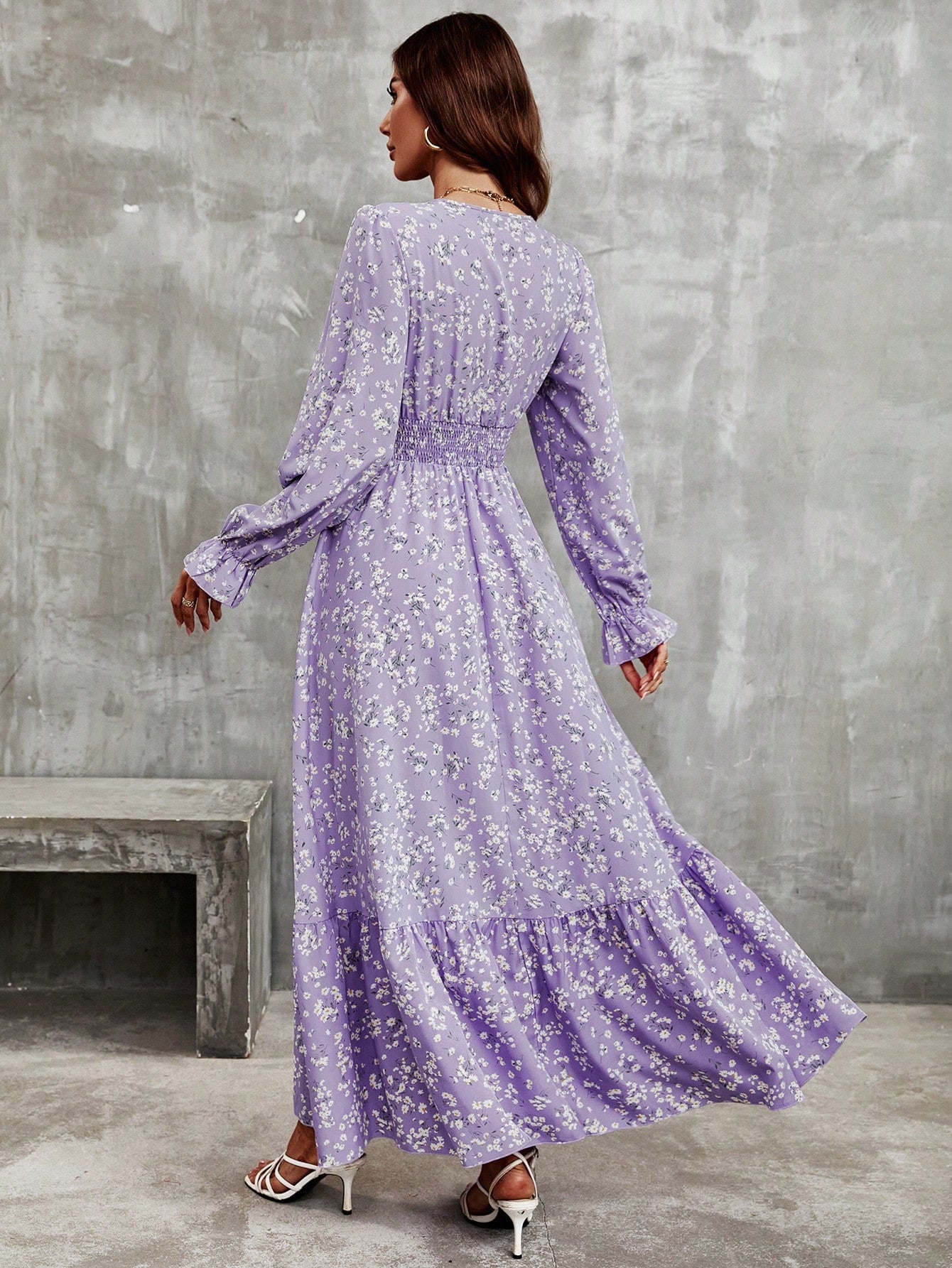 Vintage Vibes: Ditsy Floral Print Dress with Flounce Sleeve and Ruffle Hem