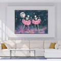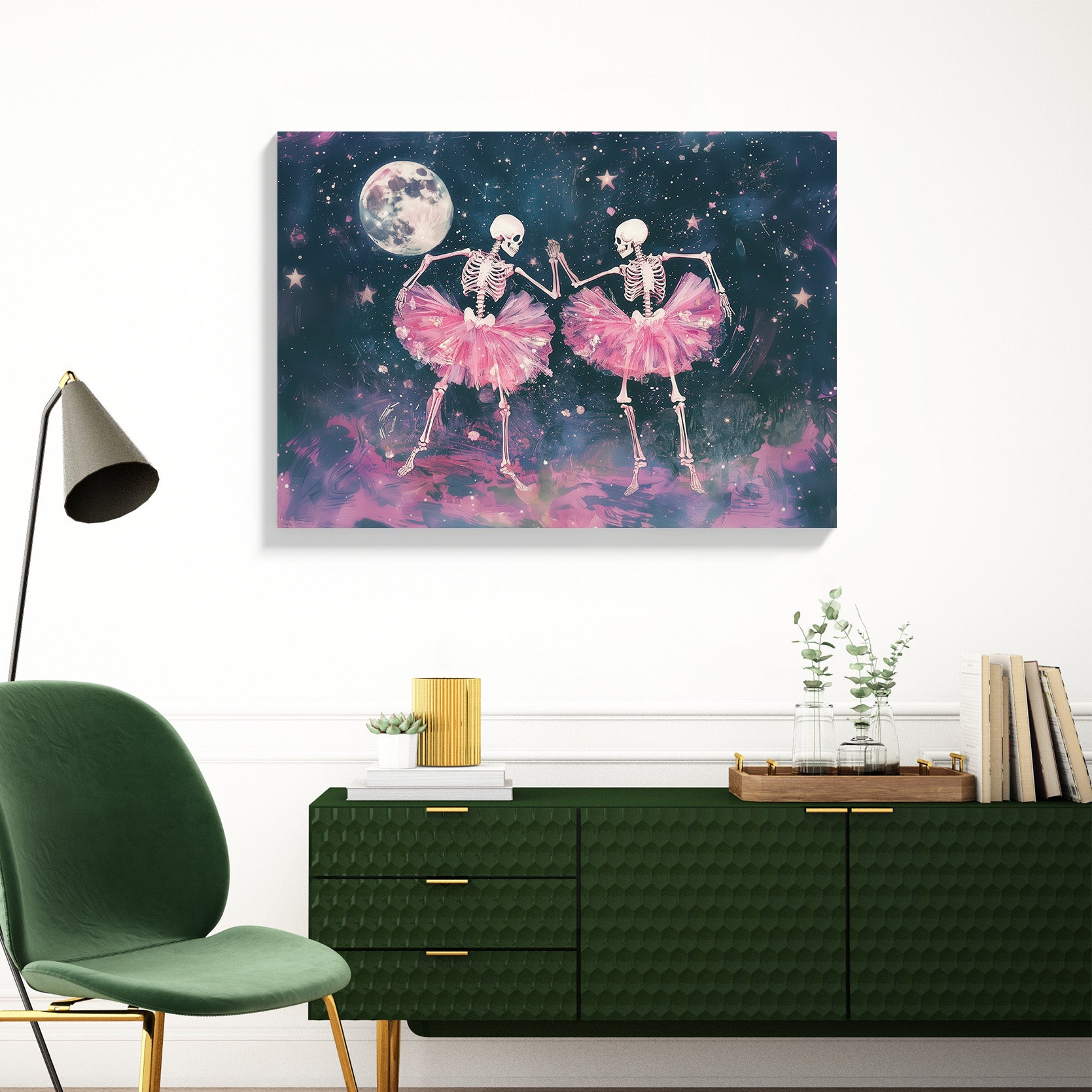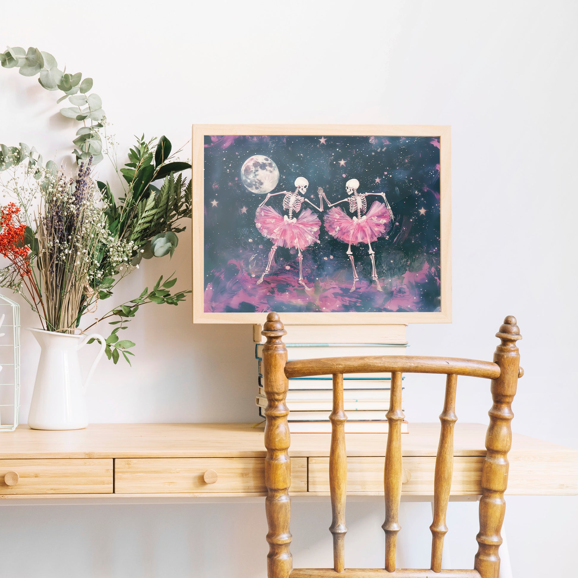 A fantastical and visually arresting digital painting that blends Gothic aesthetics with whimsical charm. Two human skeletons, adorned in vibrant, voluminous pink tulle tutu skirts, are depicted dancing against a mysterious, deep blue and purple cosmic background. A large, detailed full moon and scattering of white stars illuminate the scene, adding a romantic yet eerie atmosphere. The style is detailed and dramatic, appealing to themes of Halloween, quirky romance, dark fantasy, and ballet. This unique piece is a striking statement for eclectic, spooky, or bohemian decor.